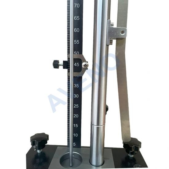 Comprobador de resiliencia de rebote vertical de caucho Se comprueba la elasticidad de los materiales de caucho mediante un martillo de caída libre. Primero, ajuste el nivel del instrumento y, a continuación, eleve el martillo a una altura de 400 mm. Al colocar la pieza de ensayo, asegúrese de que el punto de caída esté a 14 mm del borde de la pieza. No se utilizan las tres primeras pruebas, y se registra la altura de rebote promedio de la cuarta, quinta y sexta.